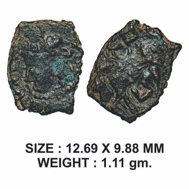 Hunnic issue, Kashmir Smast, Copper unit. 1.11g, Obv: Sassanian type king bust facing to left with traces of legend, Rev: Traces of Brahmi legend. About Very Fine, Scarce.