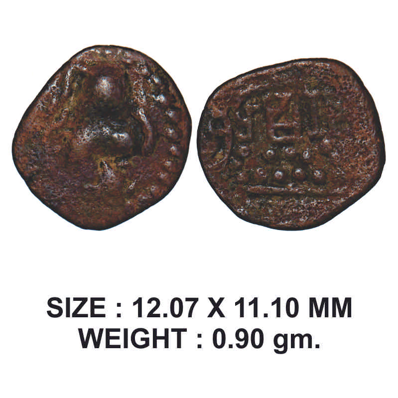 Kalchuris of Mahishmati, Krishnaraja (550-575 AD), Copper, 0.90g, Obv: Seated Bull facing to right within dotted border, Rev: Brahmi legend ' Sri Kishnaraja' above dotted hill within dotted circle. W.Pieper 918. About Very Fine, Scarce.
