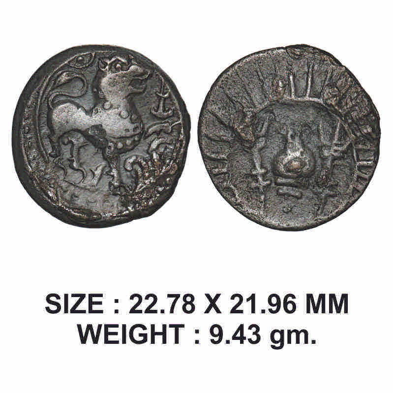 Vishnukundin Dynasty, Andhra Region, Copper Base Alloy, 9.43g, Obv: Roaring lion walking to right upraised paw front of srivatsa symbol, Rev: Conch shell flanked by two tridents within a rayed circular border. Mitch K&A 179. About Very Fine, Scarce.