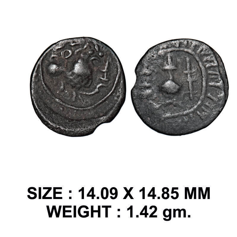 Vishnukundin Dynasty, Andhra Region, Copper Base Alloy, 1.42g, Obv: Roaring Lion walking to right upraised paw front of srivatsa symbol around circle , Rev: Conch shell flanked by two tridents within a rayed circular border. About Very Fine, Scarce.