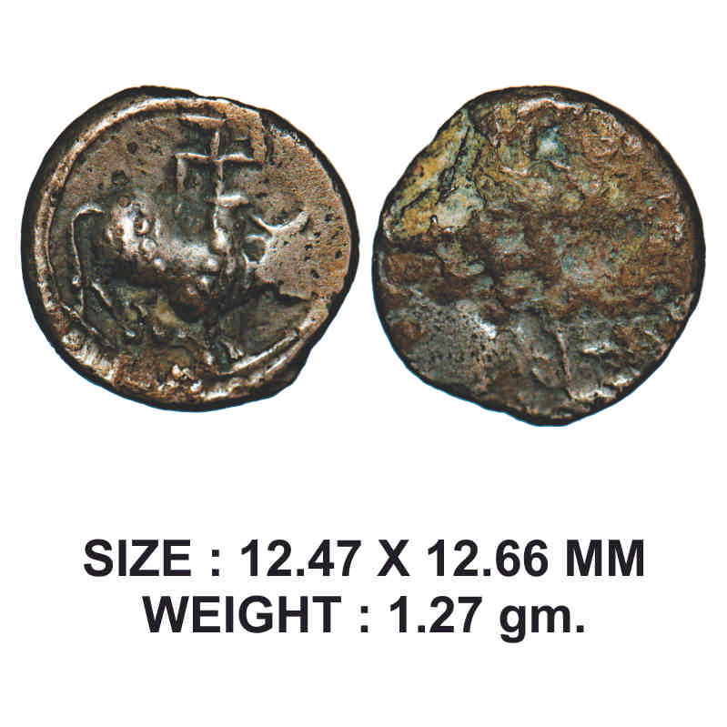Post-Vakataka, Khandesh Region, Copper base Alloyed, 1.27g, Obv: Humped bull standing facing to right side above swastika, Rev: Worn out. About Very Fine, Scarce.