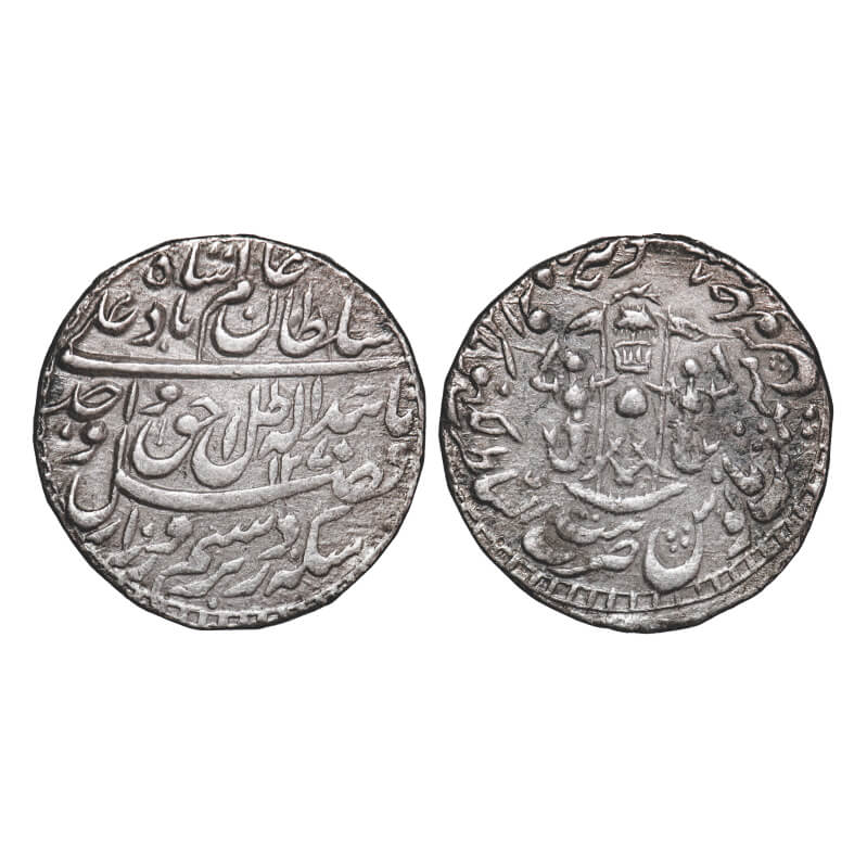 | Awadh, Silver Rupee, 10.91g, Wajid Ali Shah (as king AH 1263-1272 / 1847-1856 AD), Bait us Sultanat Lakhnau Mulk Awadh Akhtarnagar Mint, AH 1270/8 RY, with no dots after AH date, date below ilah. MKDM 11.61 unlisted type. About Extremely Fine, Scarce. |