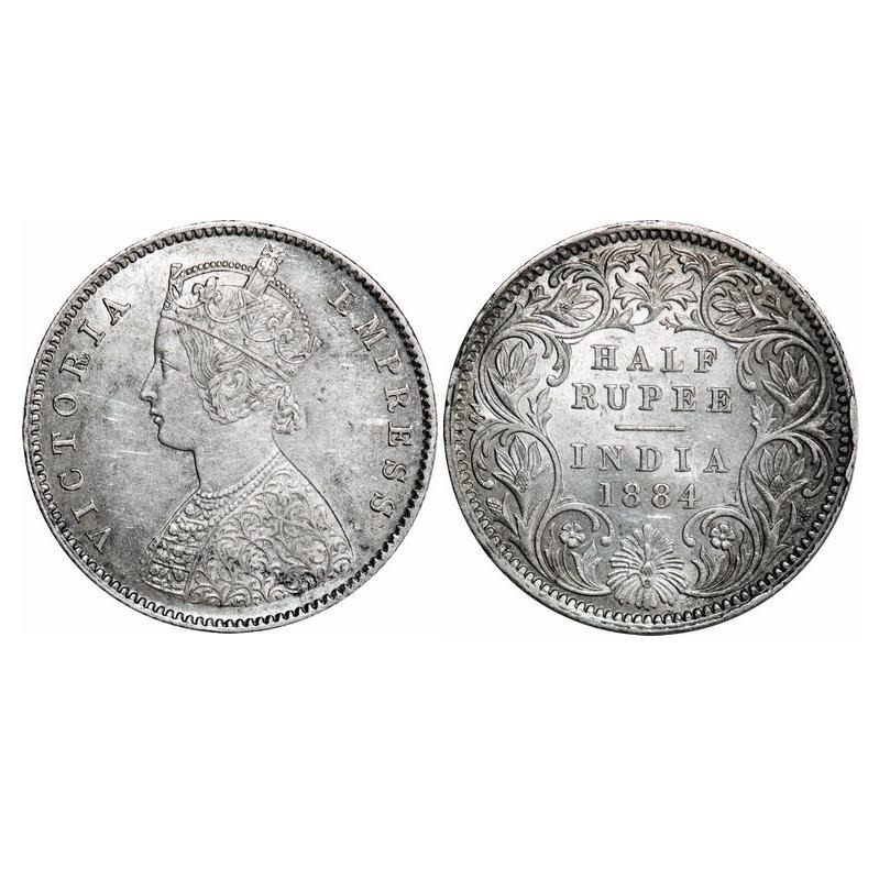 Victoria Empress, Silver, Half Rupee, 1884, Calcutta Mint, A/I, 'C' incused. F. Prid 268. GK 628. About Uncirculated. Rare.