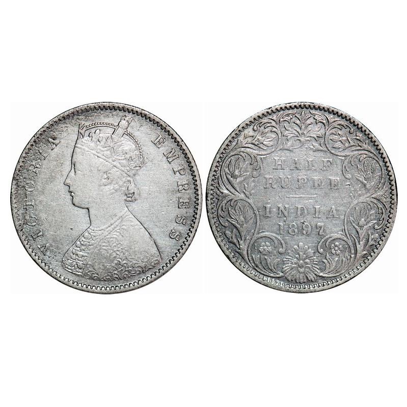 Victoria Empress, Silver, Half Rupee, 1897, Bombay Mint, A/I, 'B' incused, Traces on numeral 4 seen behind numeral 7. F. Prid. GK 653. Fine+. Rare.