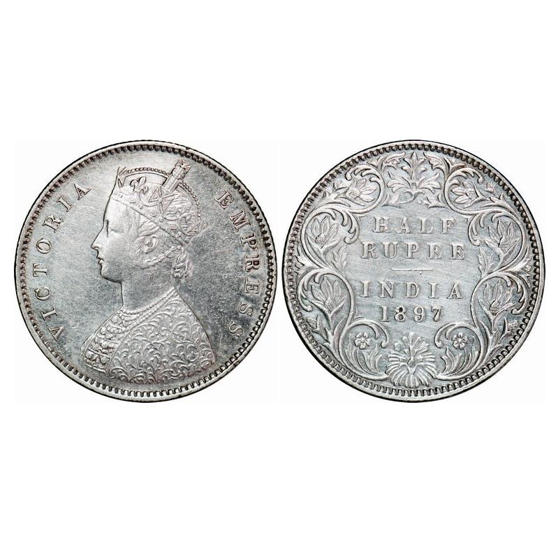 Victoria Empress, Silver, Half Rupee, 1897, Bombay Mint, A/I, 'B' incused, Traces on numeral 6 seen behind numeral 7, Double strucked Rev. F. Prid 305. GK 654. Extremely Fine+. Rare. |