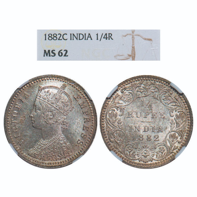 Victoria Empress, Silver, 1/4 Rupee, 1882, Calcutta Mint, C/II, 'C' incused. F. Prid 387. GK 687. NGC Slabbed MS 62. Very Rare.