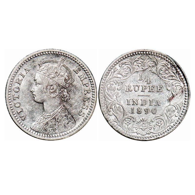 Victoria Empress, Silver, 1/4 Rupee, 1890, Calcutta Mint, C/II, 'C' incused. F. Prid 395. GK 719. About Uncirculated. Scarce.