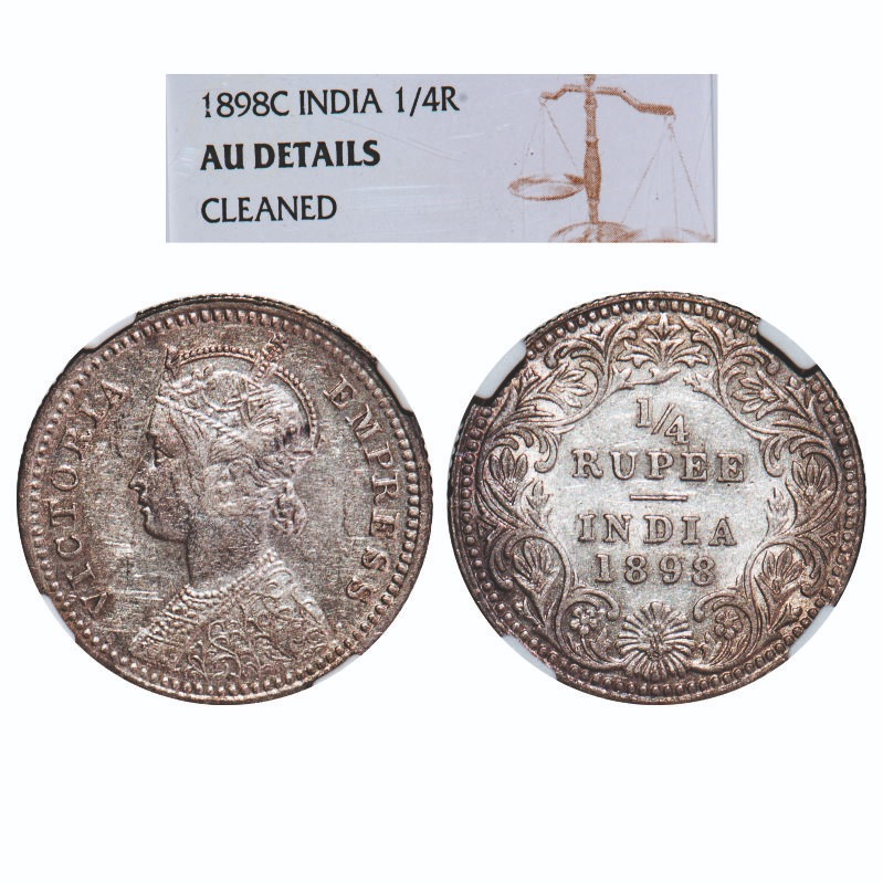 Victoria Empress, Silver, 1/4 Rupee, 1898, Calcutta Mint, C/II, 'C' incused. F. Prid 402. GK 735. NGC Slabbed AU Details, Cleaned. Scarce.
