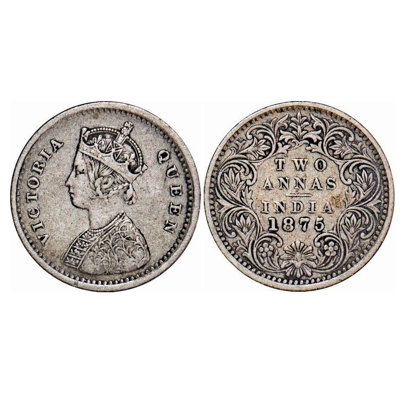 Victoria Queen, Silver, 2 Annas, 1875, Bombay Mint, A/I, No mint mark, No dot. F. Prid 517. GK 741. Very Fine. Scarce.