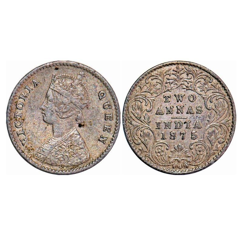 Victoria Queen, Silver, 2 Annas, 1875, Bombay Mint, A/I, No mint mark, No dot. F. Prid 517. GK 741....