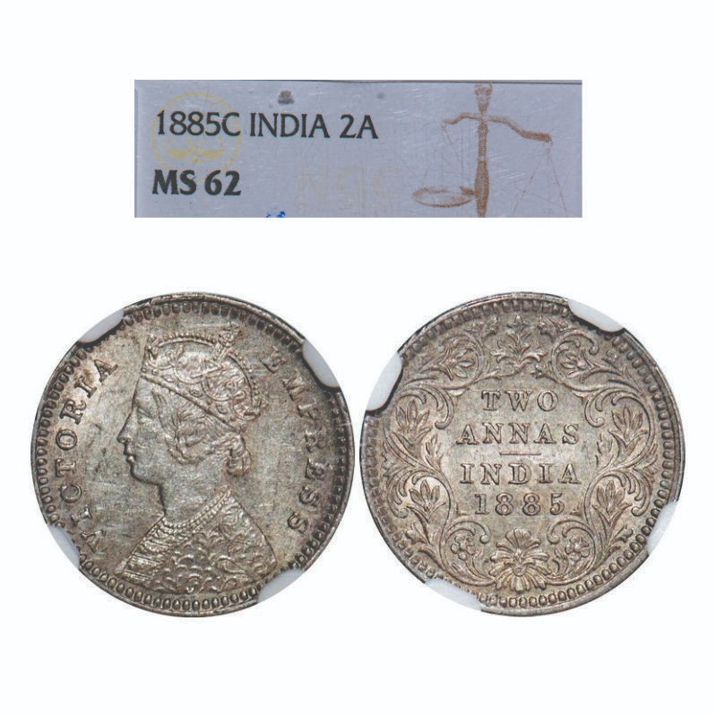 Victoria Empress, Silver, 2 Annas, 1885, Calcutta Mint, B/II, 'C' incused. F. Prid 500. GK 779. NGC Slabbed MS 62. Very Rare.