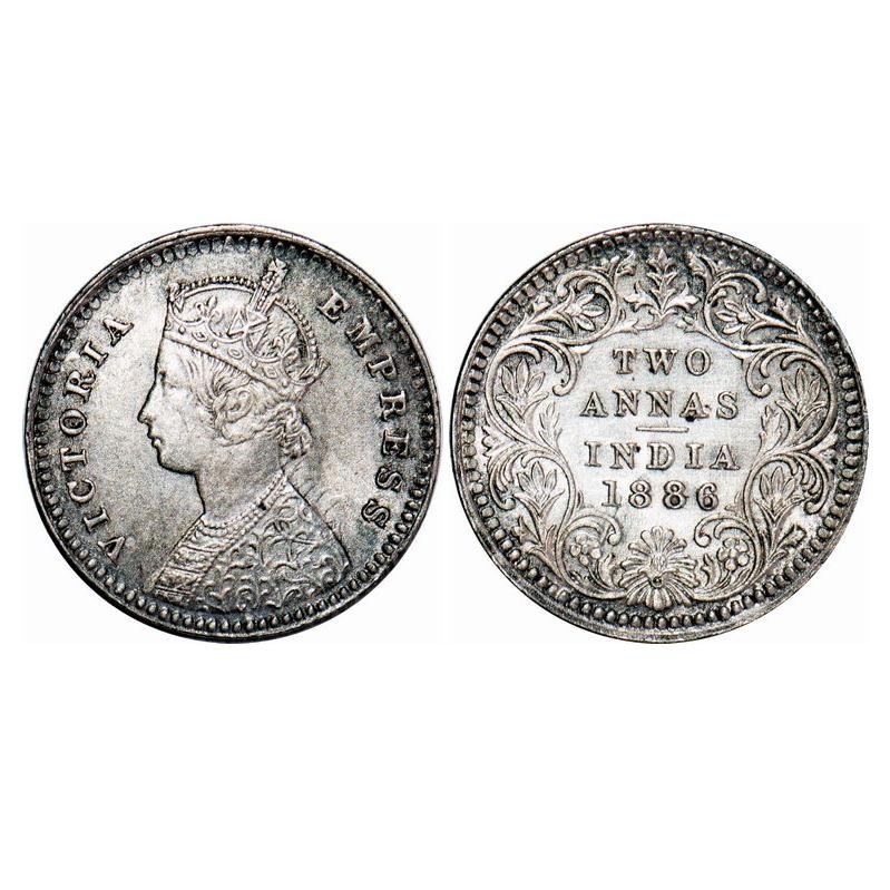 Victoria Empress, Silver, 2 Annas, 1886, Calcutta Mint, B/II, 'C' incused. F. Prid 501. GK 782. Almost Uncirculated. Very Scarce.