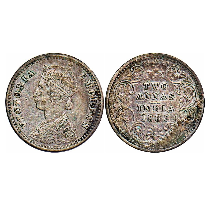 Victoria Empress, Silver, 2 Annas, 1889, Bombay Mint, B/II, 'B' incused F. Prid 542. GK 787. About Extremely Fine. Scarce.