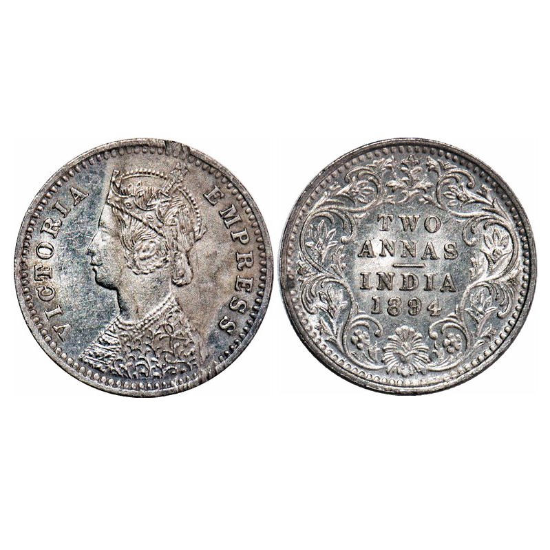 Victoria Empress, Silver, 2 Annas, 1894, Bombay Mint, B/II, 'B' incused, Ghost on Rev. F. Prid 549. GK 801. About Uncirculated. Scarce.