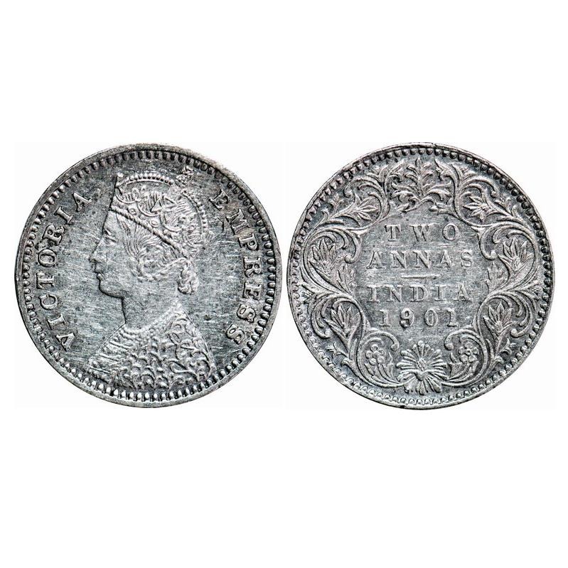 Victoria Empress, Silver, 2 Annas, 1901, Bombay Mint, B/I, 'B' incused. F. Prid 555. GK 816. Extremely Fine+. Rare.