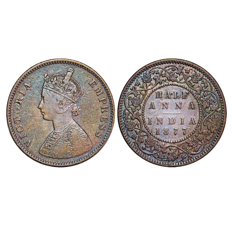 Victoria Empress, Copper, Half Anna, 1877, Bombay Mint, B/II. F. Prid 586. GK 820. About Very Fine. Scarce.