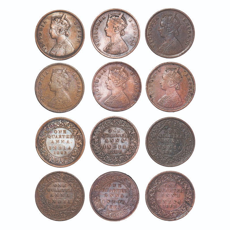 Victoria Queen & Empress, Copper, Quarter Anna, (lot of 6 coins), 1) 1862, Bombay Mint, A/I, No mint mark, Tiny V incused, 2) 1883, Bombay Mint, B/I, No mint mark, 3) 1887, Bombay Mint, B/I, No mint mark, 4) 1888, Bombay Mint, B/I, No mint mark, 5) 1895, Calcutta Mint, B/II, No mint mark, 6) 1900, Calcutta Mint, B/II, No mint mark. F. Prid 602, 639, 642, 643, 628, 633. GK 397, 836, 843, 845, 854, 859. Very Fine to Extremely Fine. Scarce as a lot. |