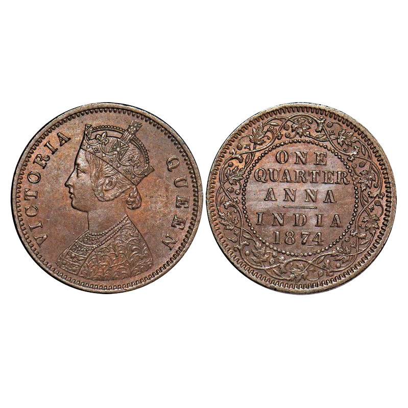 Victoria Queen, Copper, Quarter Anna, 1874, Calcutta Mint, B/II, No mint mark. F. Prid 608. GK 823. Almost Uncirculated. Very Scarce.