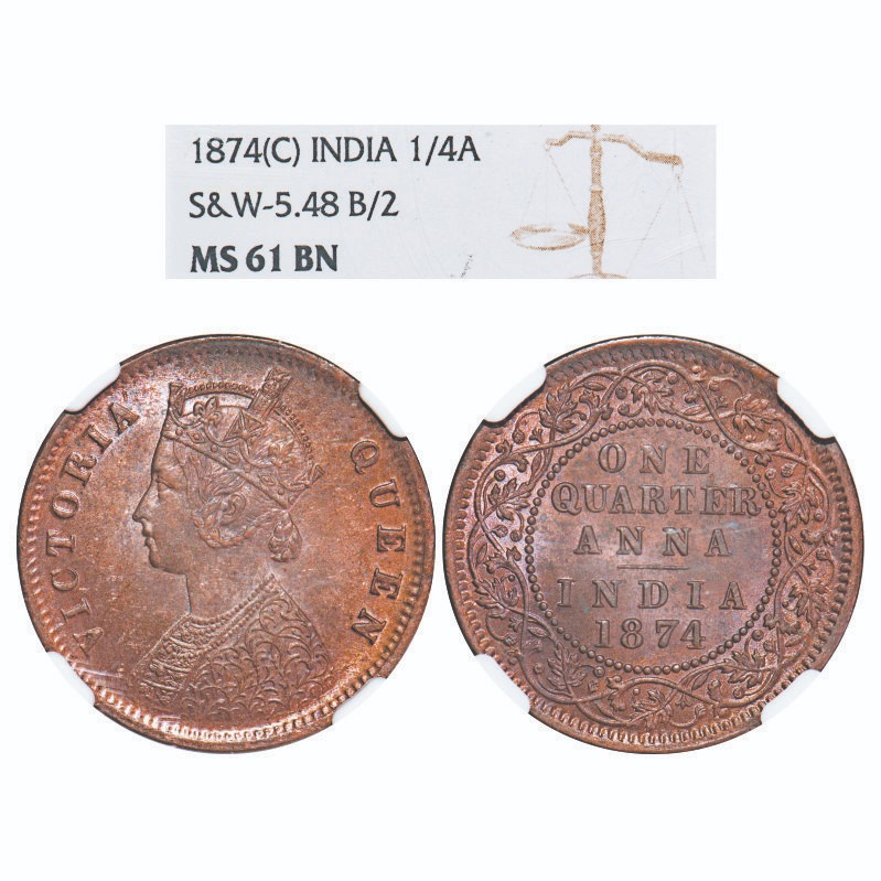 Victoria Queen, Copper, Quarter Anna, 1874, Calcutta Mint, B/II, No mint mark. F. Prid 608. GK 823. NGC Slabbed MS 61 BN. Very Scarce.