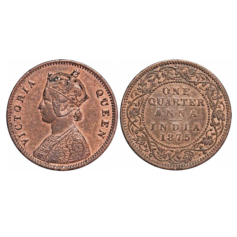 Victoria Queen, Copper, Quarter Anna, 1875, Bombay Mint, A/I, No mint mark. F. Prid 635. GK 824. Very Fine+. Scarce.
