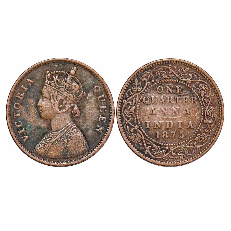 Victoria Queen, Copper, Quarter Anna, 1875, Bombay Mint, A/I, No mint mark. F. Prid 635. GK 824. Very Fine. Scarce.