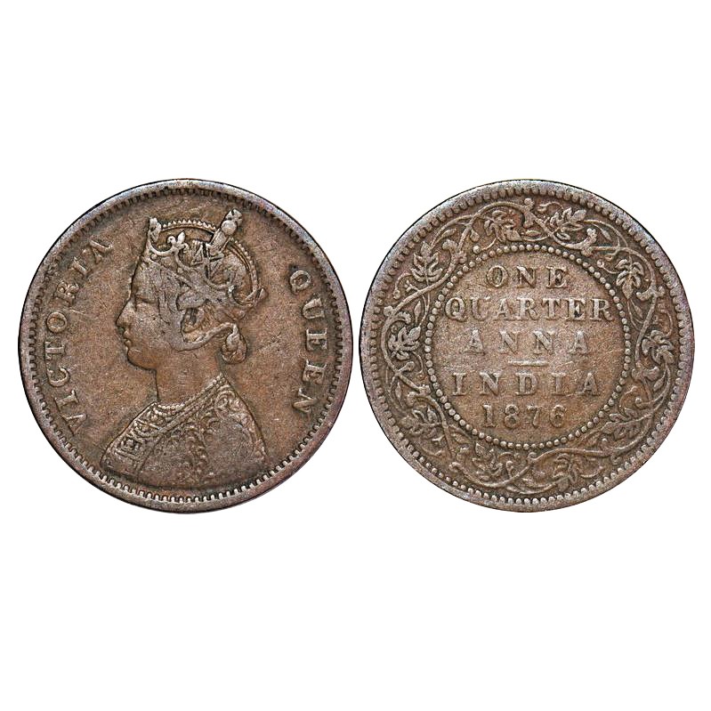 Victoria Queen, Copper, Quarter Anna, 1876, Bombay Mint, A/I, No mint mark. F. Prid 636. GK 826. Very Fine. Scarce.