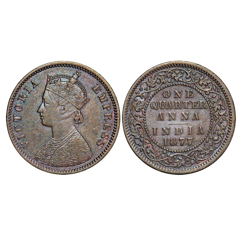 Victoria Empress, Copper, Quarter Anna, 1877, Calcutta Mint, B/II, No mint mark. F. Prid 611. GK 829. Very Fine+. Scarce.
