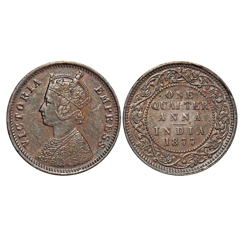 Victoria empress, Copper, Quarter Anna, 1877, Bombay Mint, B/I, No mint mark. F. Prid 637. GK 828. Extremely Fine+. Very Scarce.