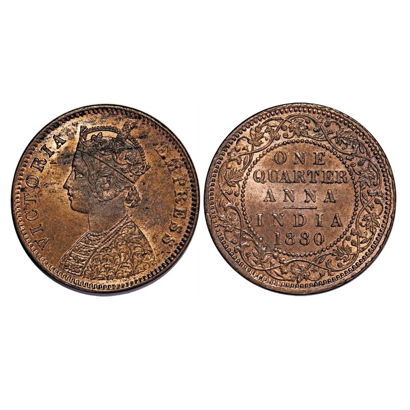 Victoria Empress, Copper, Quarter Anna, 1880, Calcutta Mint, B/II, 'C' incusced. F. Prid 614. GK 833. Uncirculated. Very Scarce.