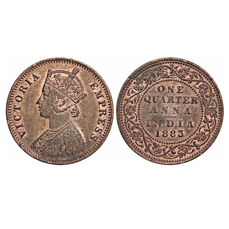 Victoria Empress, Copper, Quarter Anna, 1883, Bombay Mint, B/I, No mint mark. F. Prid 639. GK 836. About Uncirculated. Very Scarce.