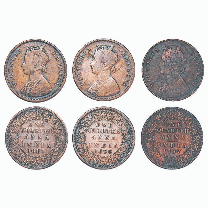 Victoria Empress, Copper, Quarter Anna, (3 coins), 1) 1887, Bombay Mint, B/I, No mint mark, 2) 1890, Calcutta Mint, B/II, No mint mark, 3) 1897, Calcutta Mint, B/II, No mint mark. F. Prid 642, 623, 630. GK 843, 849, 856. Very Fine. Scarce. |