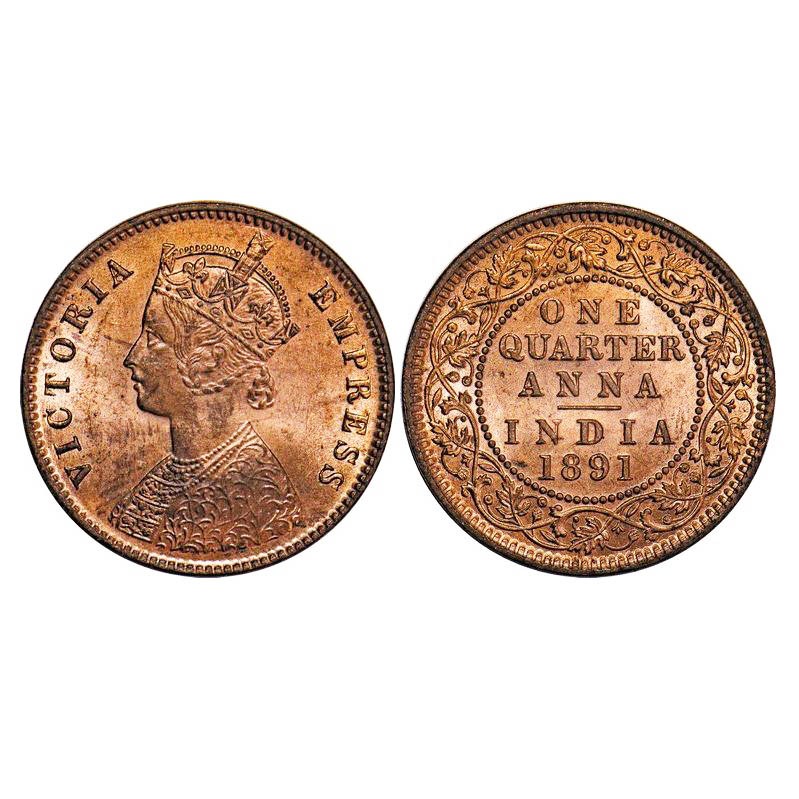 Victoria Empress, Copper, Quarter Anna, 1891, Calcutta Mint, B/II, No mint mark. F. Prid 624. GK 850. Brilliant Uncirculated. Very Scarce.