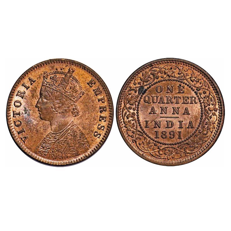 Victoria Empress, Copper, Quarter Anna, 1891, Calcutta Mint, B/II, No mint mark, Ghost on Rev. F. Prid 624. GK 850. Uncirculated. Very Scarce.