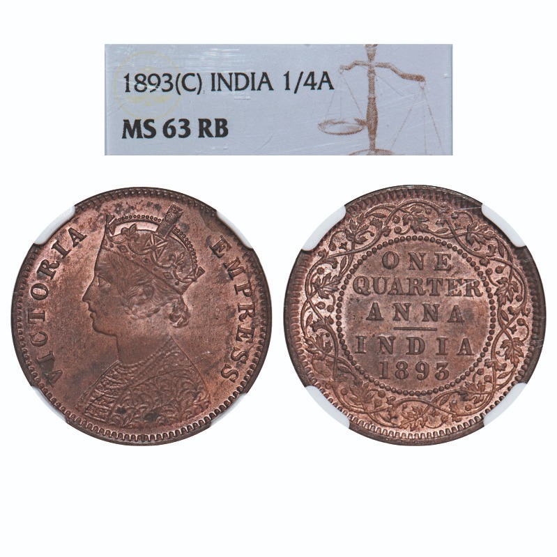 Victoria Empress, Copper, Quarter Anna, 1893, Calcutta Mint, B/II, No mint mark. F. Prid. GK 852. NGC Slabbed MS 63 RB. Very Rare.