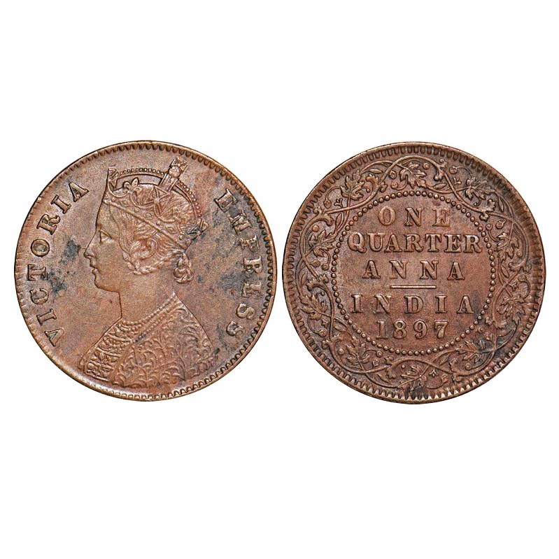 Victoria Empress, Copper, Quarter Anna, 1897, Calcutta Mint, B/II, No mint mark. F. Prid 630. GK 85...