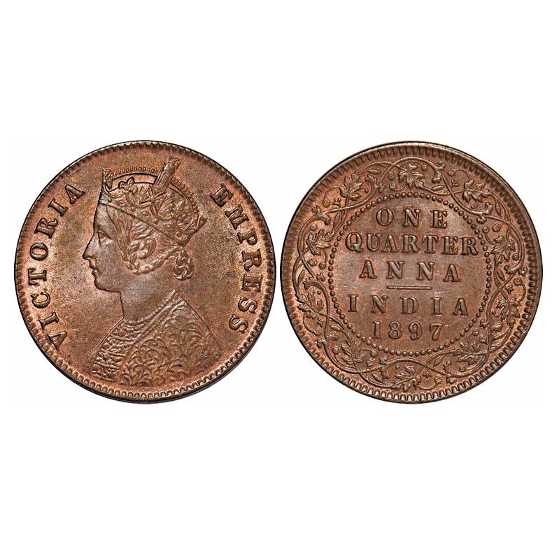 Victoria Empress, Copper, Quarter Anna, 1897, Calcutta Mint, B/II, No mint mark. F. Prid 630. GK 856. Almost Uncirculated. Very Scarce.