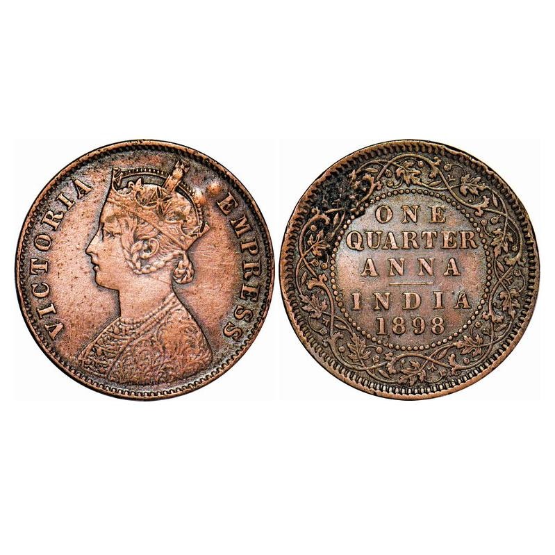 Victoria Empress, Copper, Quarter Anna, 1898, Calcutta Mint, B/II, No mint mark. F. Prid 631. GK 857. Very Fine. Scarce.