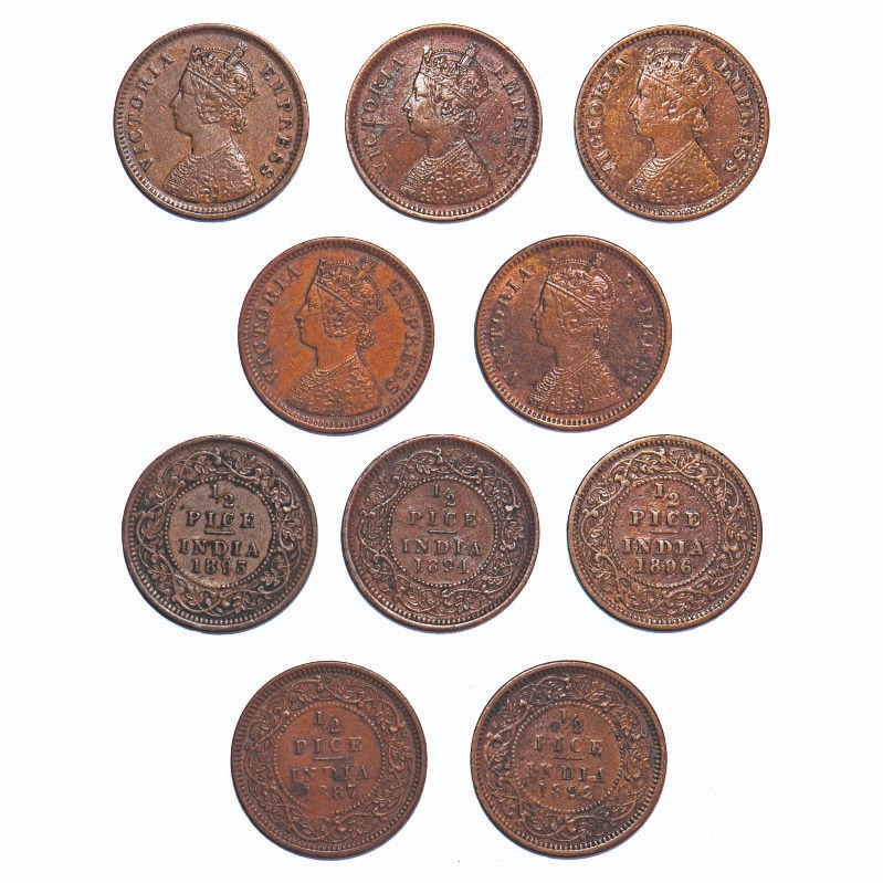 Victoria Empress, Copper, 1/2 Pice, (Lot of 5 coins), 1887, 1892, 1893, 1894, 1896, Calcutta Mint, A/I, No mint mark. F. Prid 719, 725, 726, 727, 729. GK 867, 872, 873, 874, 876. Very Fine+ to Extremely Fine+. Scarce as a lot. |