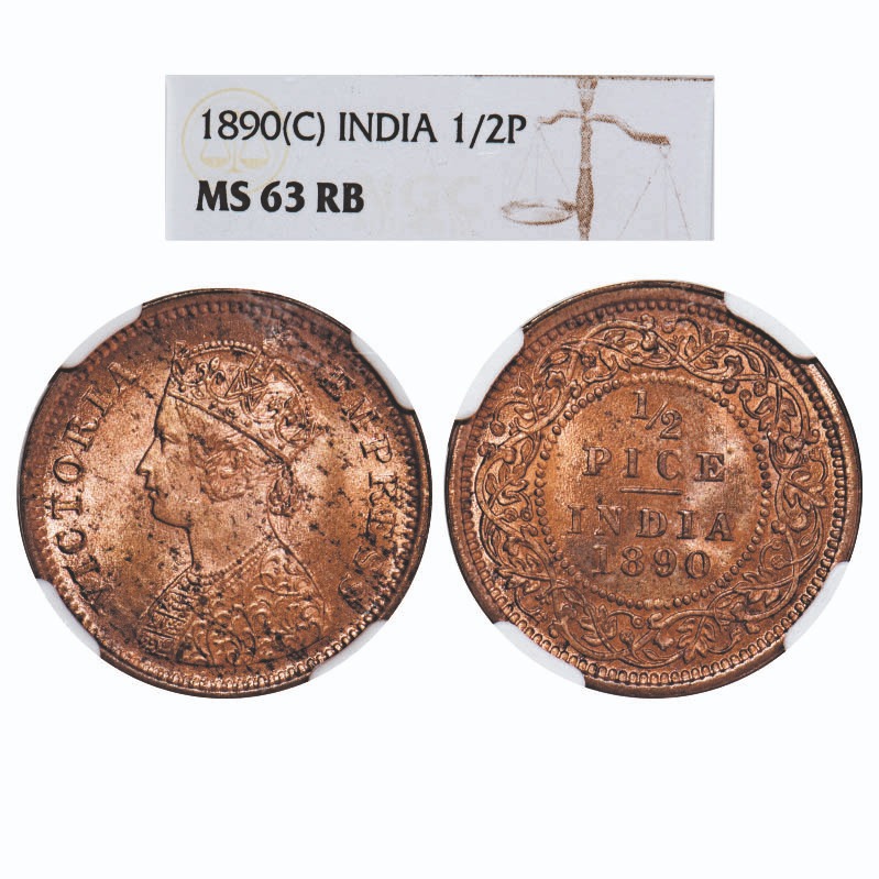 Victoria Empress, Copper, 1/2 Pice, 1890, Calcutta Mint, A/I, No mint mark. F. Prid 722. GK 870. NGC Slabbed MS 63 RB. Very Rare.