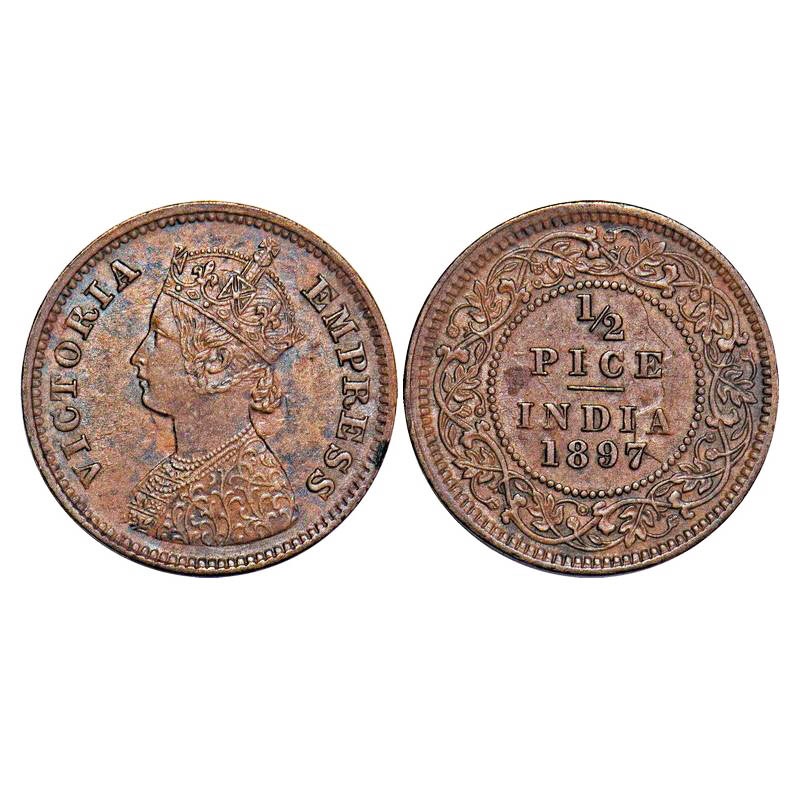 Victoria Empress, Copper, 1/2 Pice, 1897, Calcutta Mint, A/I, No mint mark, Full skull ghost on Rev. F. Prid 730. GK 877. Uncirculated. Very Scarce.