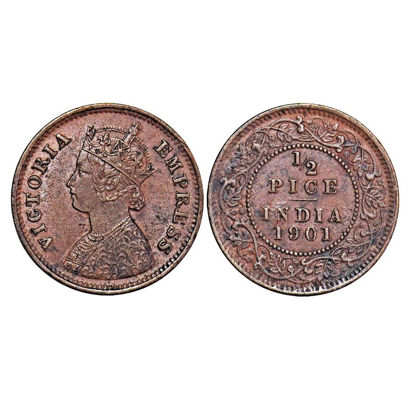 Victoria Empress, Copper, 1/2 Pice, 1901, Calcutta Mint, A/I, No mint mark, Die crack on Obv, Numeral 1 of year date 1901 seen on Obv. F Prid 734. GK 881. Extremely Fine+. Scarce.