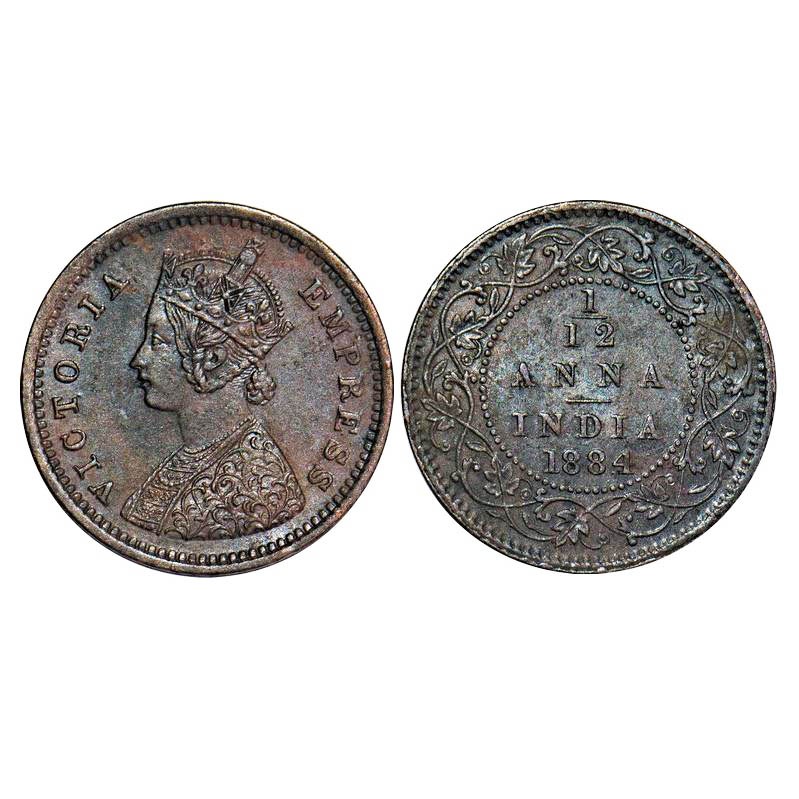Victoria Empress, Copper, 1/12 Anna, 1884, Bombay Mint, Obv A, No mint mark. F. Prid 812. GK 898. Almost Uncirculated. Very Scarce.