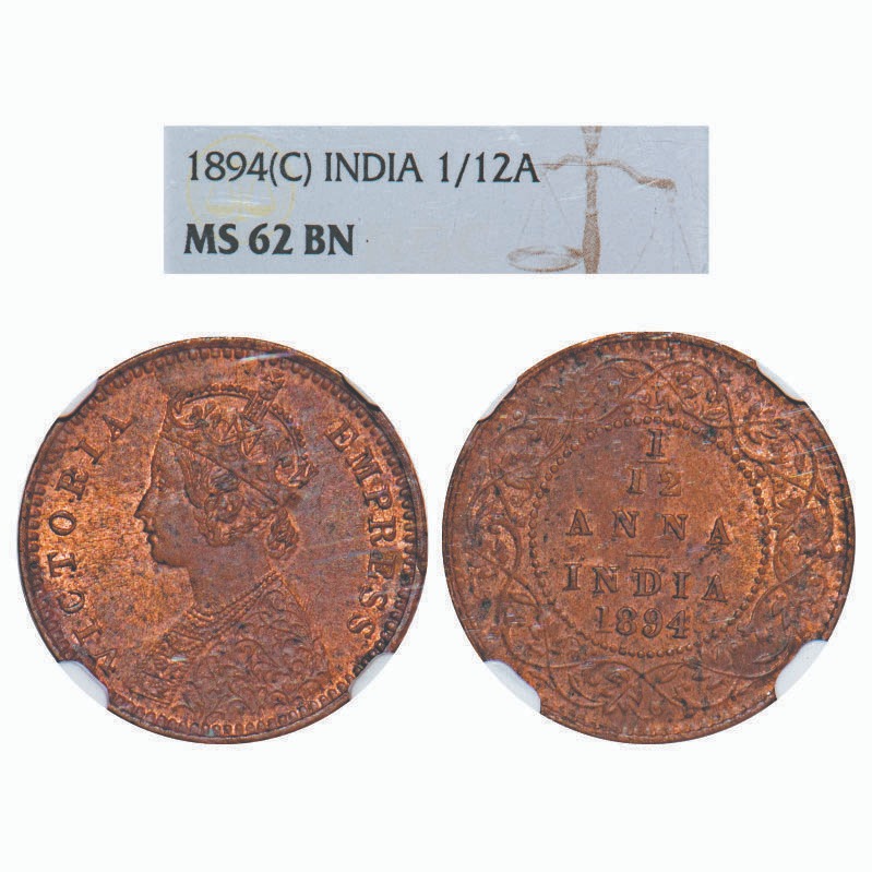 Victoria Empress, Copper, 1/12 Anna, 1894, Calcutta Mint, Obv B, No mint mark. F. Prid 799. GK 915. NGC Slabbed MS 62 BN. Very Scarce.
