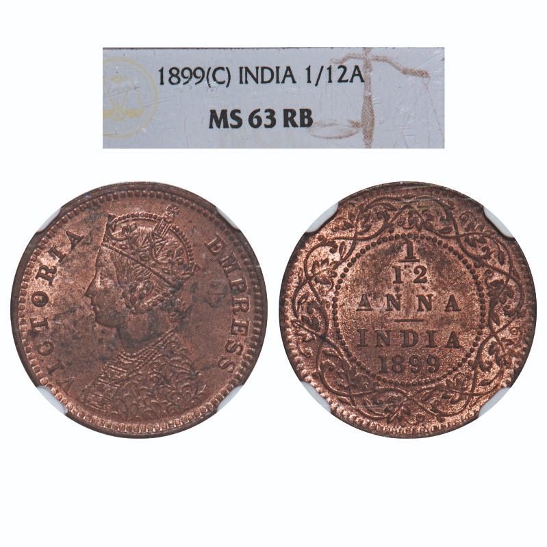 Victoria Empress, Copper, 1/12 Anna, 1899, Calcutta Mint, Obv B, No mint mark. F. Prid 794. GK 910. NGC Slabbed MS 63 RB, Rare.
