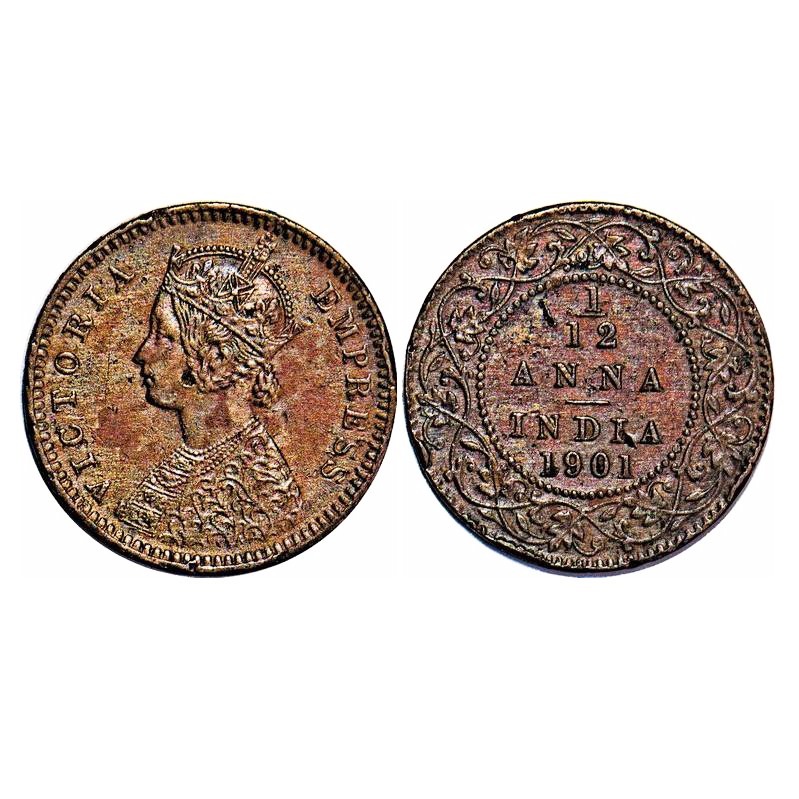 Victoria Empress, Copper, 1/12 Anna, 1901, Calcutta Mint, Obv B, No mint mark. F. Prid 805. GK 921. Extremely Fine+. Scarce.