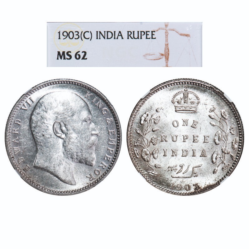 Edward VII, Silver, Rupee, 1903, Calcutta Mint, No mint mark, Normal 5 Diamonds. F. Prid. GK 924. NGC Slabbed MS 62. Very Rare.
