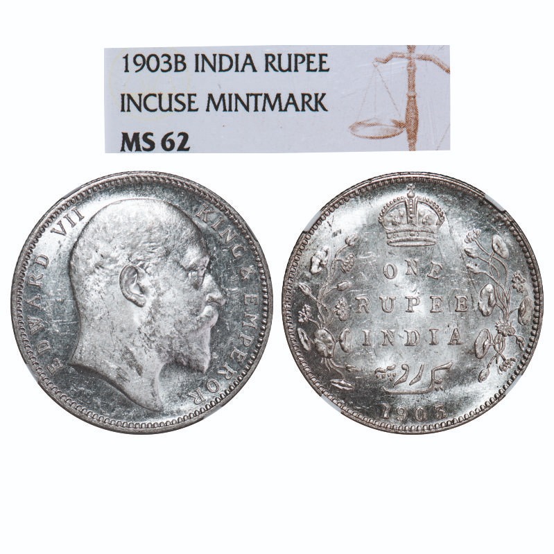 Edward VII, Silver, Rupee, 1903, Bombay Mint, 'B' incused and dot. F. Prid 199. GK 926. NGC Slabbed MS 62. Rare.