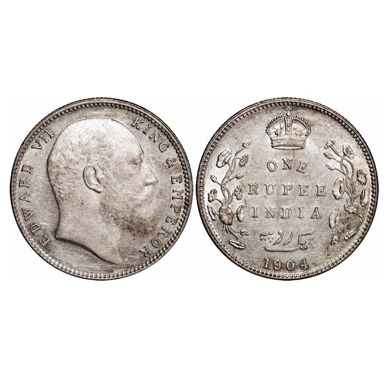Edward VII, Silver, Rupee, 1904, Bombay Mint, 'B' incused and dot, 5 Diamonds and bottom stroke of numeral 4 short. F. Prid 200. GK 932. Uncirculated with original mint luster. Very Scarce.