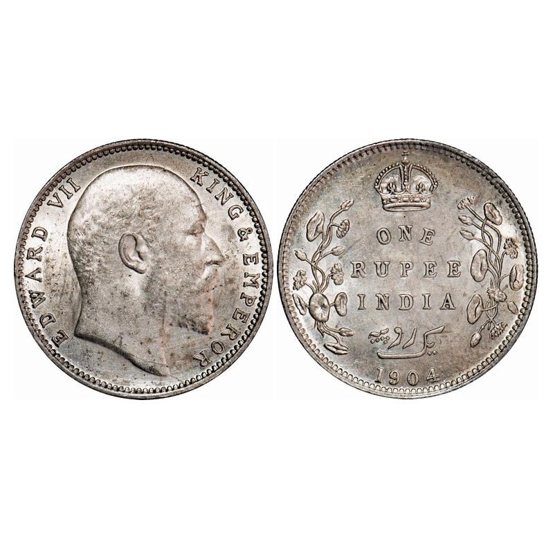 Edward VII, Silver, Rupee, 1904, Bombay Mint, 'B' incused and dot, 5 Diamonds and bottom stroke of numeral 4 long. F. Prid 200. GK 933. Uncirculated with luster. Very Scarce.