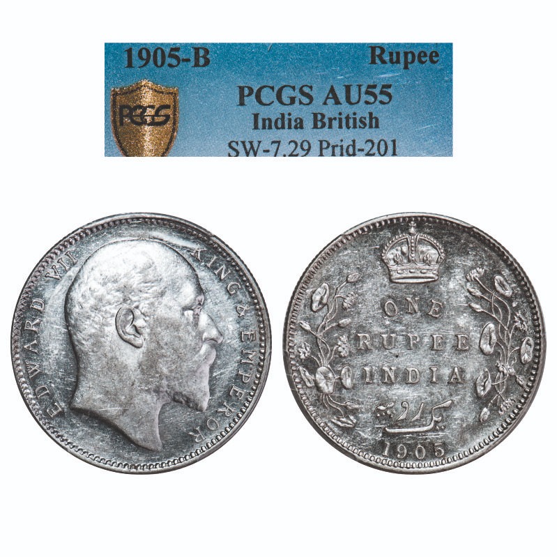 Edward VII, Silver, Rupee, 1905, Bombay Mint, 'B' incused and dot, top stroke of numeral 5 long. F. Prid. 201. GK 936. PCGS Slabbed AU 55. Very Scarce.
